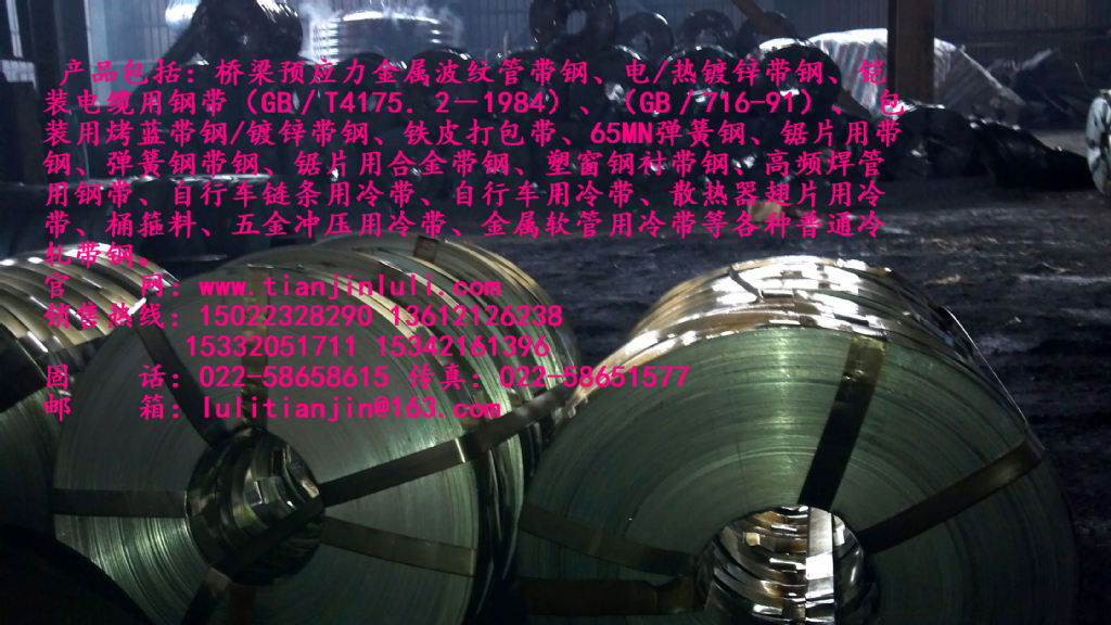 我公司生产发蓝打包钢带,涂漆打包钢带,电镀锌打包钢带,电解带钢,热镀锌带钢,光亮退火带钢,打包扣等产品.