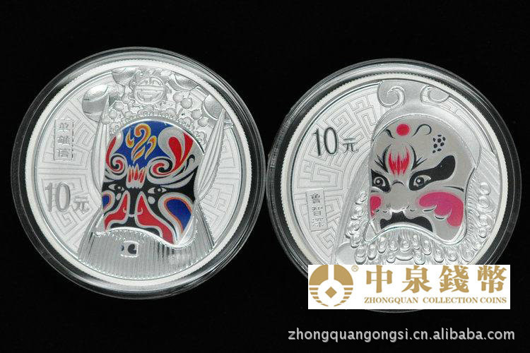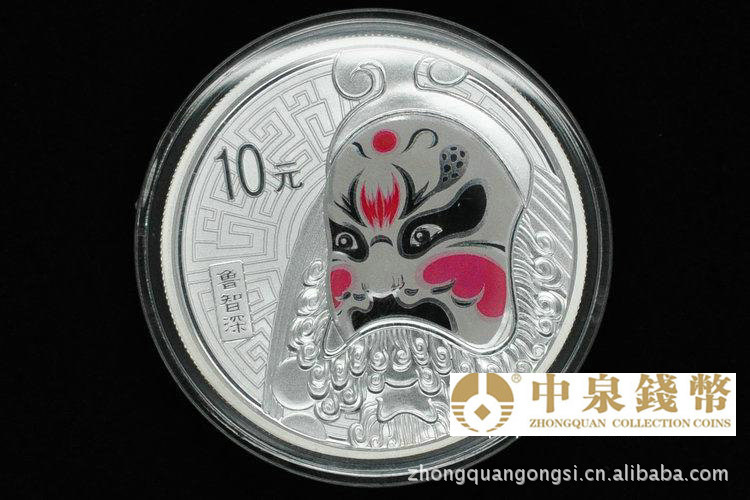 1盎司圆形彩色银质纪念币背面图案为表现嫉恶如仇、扶正济贫的“鲁智深”京剧脸谱造型(局部彩色),并刊“鲁智深”中文字样及面额。