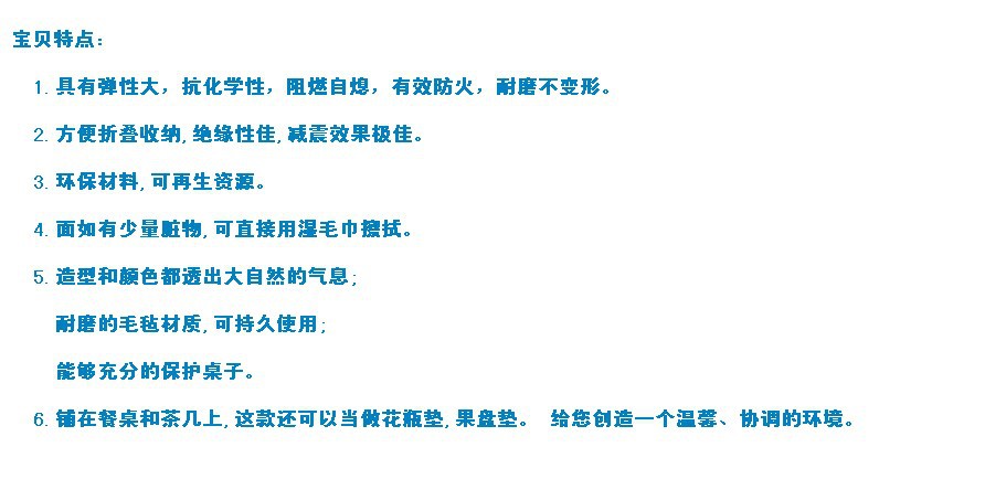 【宝贝特性】:防滑 隔热 吸水 易清洗(清洗超方便哦)