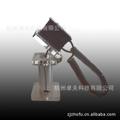 一款采用内置可伸缩钢丝螺旋线的数码产品透明水晶展示防盗架;可用于手机,导航仪,MP4等数码产品的模型展示陈列使用;陈列架采用透明水晶材质制作,在彰显被保护产品的高档同时,更提升了整体店面的形象。