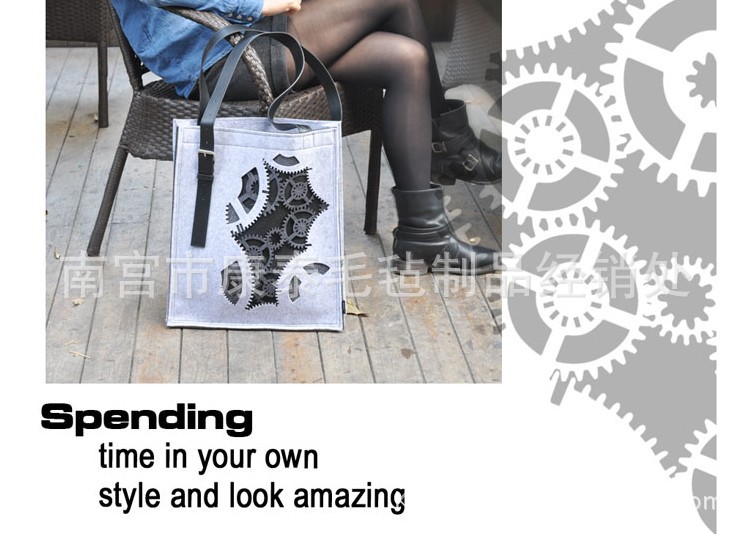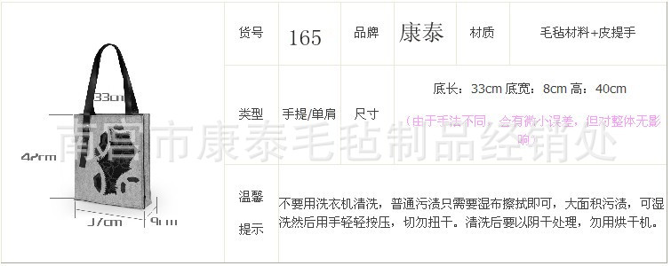 ③毛毡产品易清洗,若小面积脏污,只需用湿布轻轻擦拭即可。大面积脏污可以干洗,一般不建议水洗,因水洗后不加注意,很容易使得包包变形。水洗完不可烘干、悬挂晾干、扭杆、甩干,应自然阴干,使用熨斗温度不得高于110℃ 。