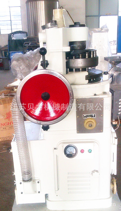 本机用以将各种颗粒原料压制成圆片状,是适合批量生产的基本设备。其结构为双压式,有两套加料装置和两套压轮。转盘上可装置33付冲模,放置一周即可压制66片。夺片时转盘的速度,物料的充填深度、压片厚度均可调节。机上的机械缓行装置可避免因过载而引起机件损坏。机内配有吸粉箱,通过吸嘴可吸取机器运转时所产生的粉尘,避免粘结堵塞,并可回收原料重新使用。