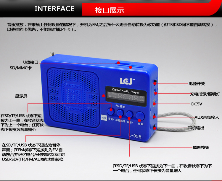 电池充电方法:当产品读USB断续,或显示闪烁时,则表示电压不够,要对产品进行充电方能正常工作方法是:随机配置的USB充电线,USB大头插在电脑USB座或手机充电器上的USB座等电源上另一头则插在本机的“DC5V”上对产品进行充电,充电时LED灯会亮,否则表示无电通过,且要注意充电源的电压为DC5V不得过高或过低!过高则会烧坏本机,过低侧充不入电!