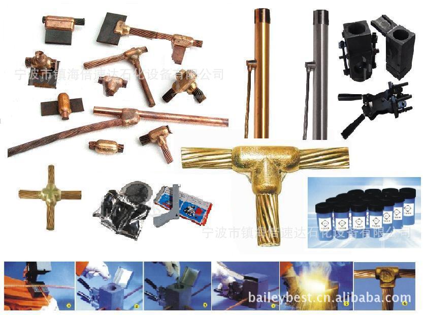 为了在不同规格,不同型号导体之间进行焊接,需要制作一个专用模具进行焊接。把需要焊接导体的两端固定在找个模具里,放入热熔焊剂,点燃引火粉,反应产生高温使粉末熔化变成液体,冷却后打开模具,被焊接导体就成为了永久性连接。我们公司针对不同的热熔焊剂规格,备有相应的配套模具。