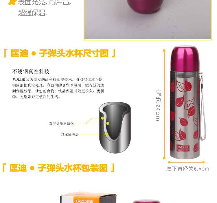 匡迪不锈钢真空系列产品,采用优质不锈钢材料,经双层加工工艺和无尾真空焊接技术精制而成,更能确保真空保温的使用效果。杯体造型简洁大方,外表采用镀膜、水晶复合或静电喷涂等先进技术处理,手感奇特。圆弧被扣结构增加了口部厚度,隔热防烫,口感舒适(专利号:0026709.8)。被盖表面采用合金电镀或水晶镭射标志等先进工艺,光彩夺目。保温性能:在20℃室温下,注入95℃以上的热水,6小时后不低于42℃。