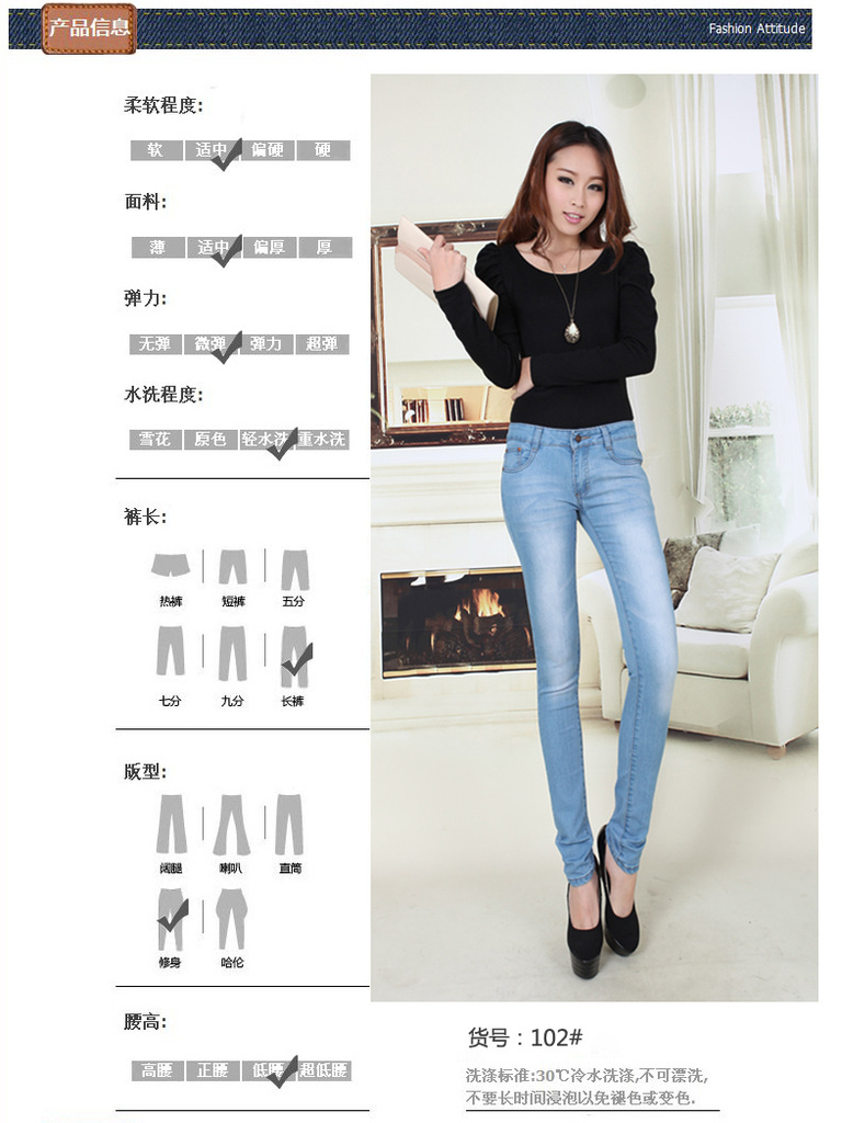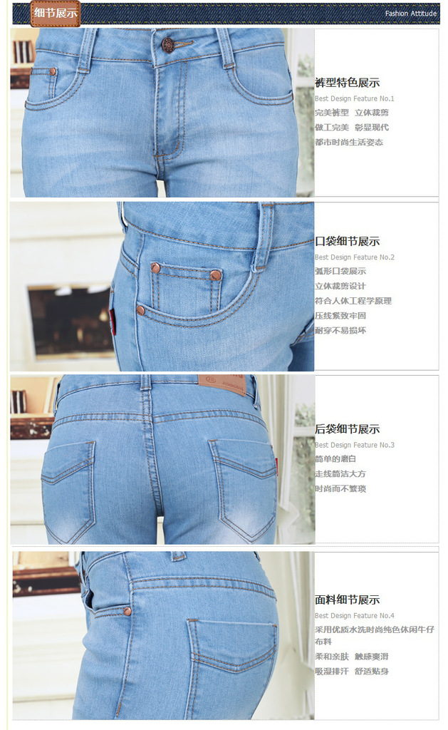 本公司主要生产:女士牛仔裤,男士牛仔裤,牛仔短裤,牛仔中裤并结合欧美,韩版等各种风格的牛仔系列饰。产品远销全球以及全国各地批发市场,国外以非洲,东南亚,如马来西亚,菲律宾,缅甸,泰国居多。质量和服务都得到了广大客户朋友的认可。产品做工精致,精选纯棉高弹性牛仔洗水布,亲肤舒适,透气好,弹性佳,不易变形,不褪色,修身廓形,经典版型,简约时尚,可以随心搭配服饰,衬托出你干净整洁的精神面貌和窈窕的身材。