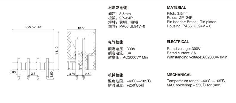 间距:3.5mm;极数:2P-24P;额定电压/电流:300V/8A