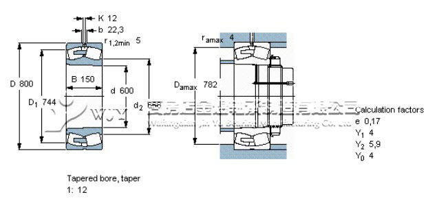 | d 600mm cylindrical and tapered bore D 800mm Spherical roller bearings B 150mm Principal dimensions Bearing 239/600 CAK/W33 Designations Pu 585kN limit Fatigue Limit Speed 750rmin Limiting Speed ratings Co 8300kN static static|Basic load ratings c 3900kN dynamic Basic load ratings Mass 220KG Speed 430r/min Limiting Speed ratings Type: Spherical roller bearings |
