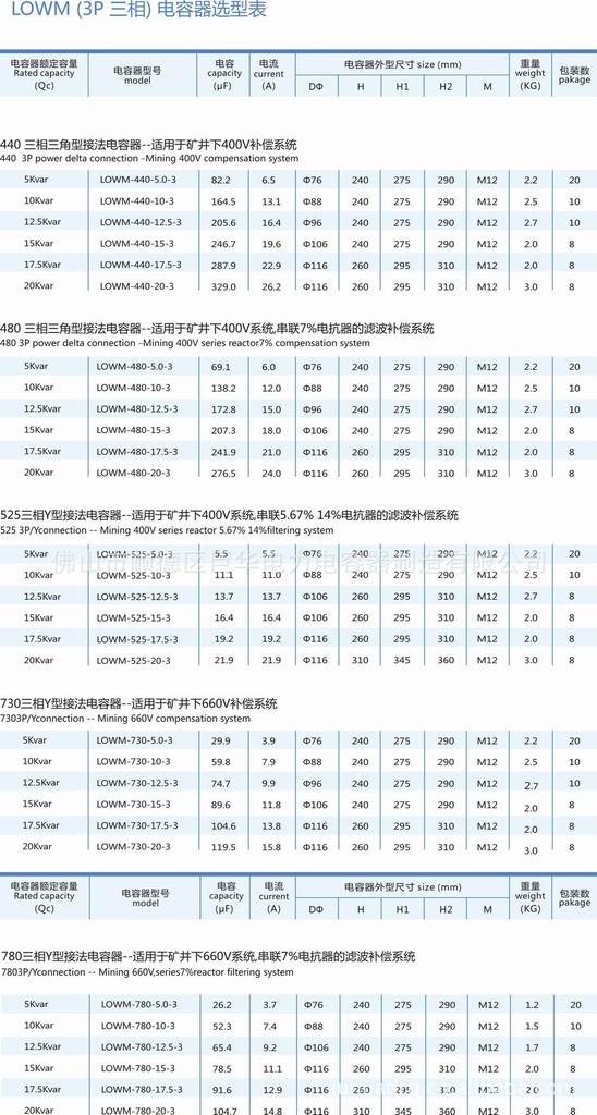 LOWM 矿井电力电容器采用冲压铝罐外壳,选用订制的高温绝缘材料,专门用于矿井下的低压去谐滤波系统或集中自动补偿用,适合于矿井下封闭防爆箱体内安装,电容器的工作温最高可达到70C°,电容器内置安全压力保护装置, 干式结构。