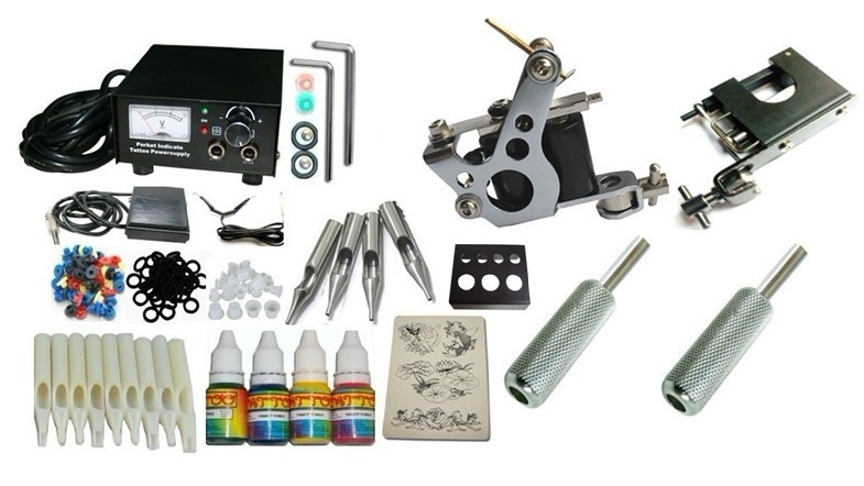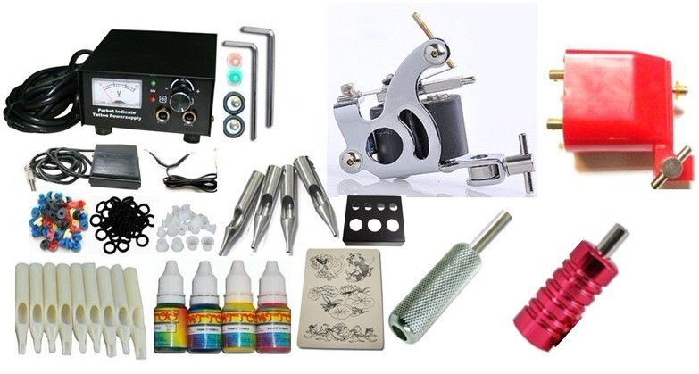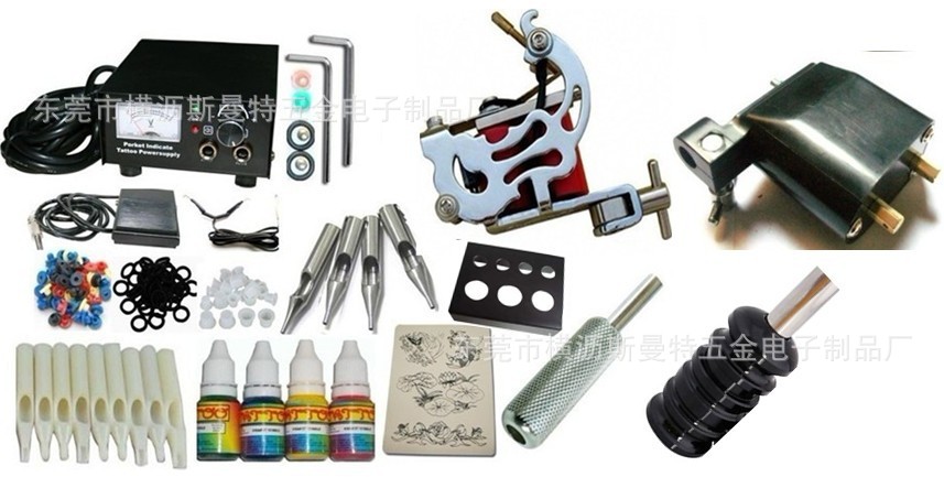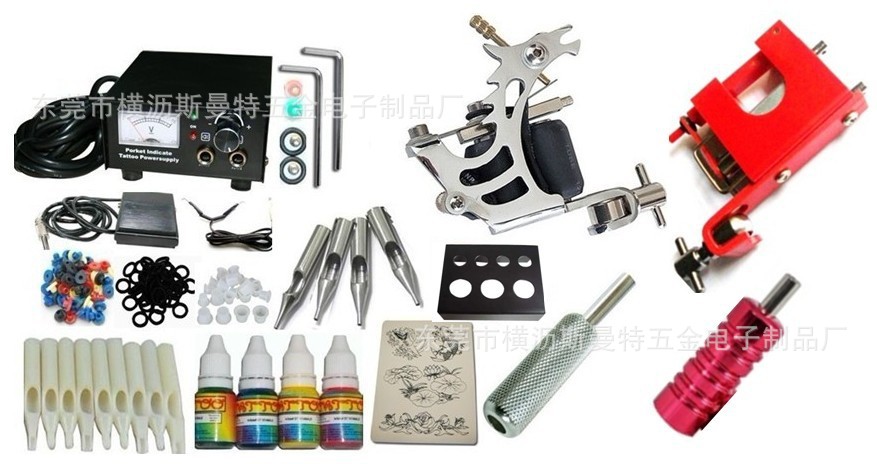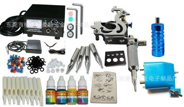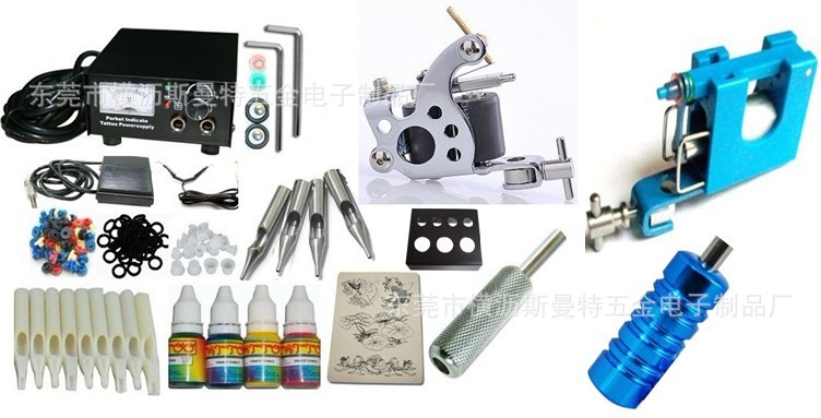 精钢纹身机一台(配手柄一个)。马达旋转纹身机一台(配手柄一个)连体电源一台,配方铁开关和勾线,合金针咀4个,一次性针咀9个,色料架一个色料杯20个,针垫20个,防震圈20个,练习皮一张,调节纹身机工具一包,说明书一份