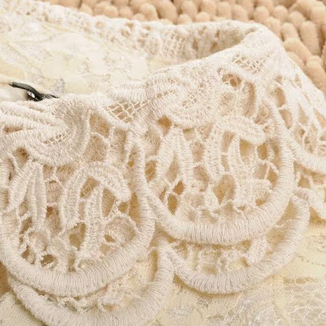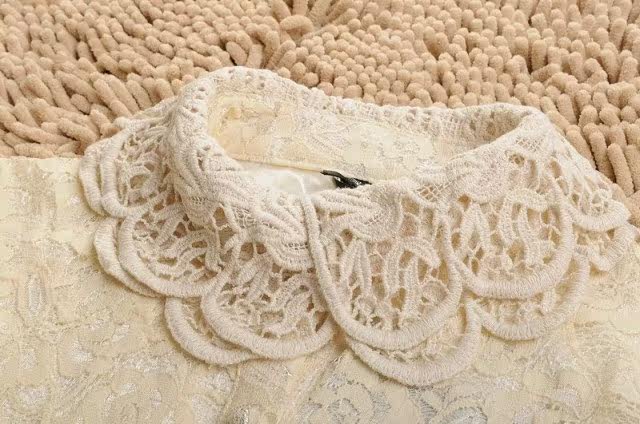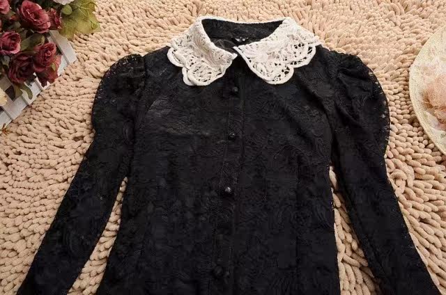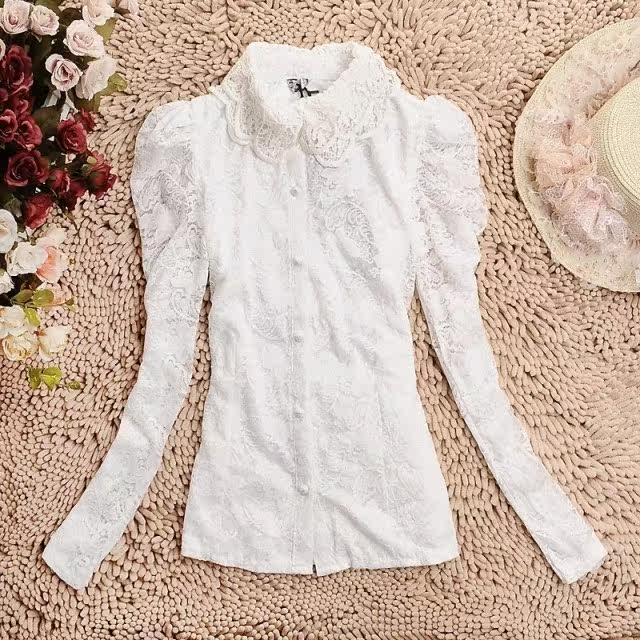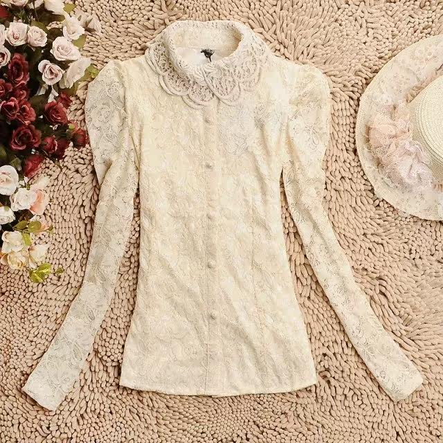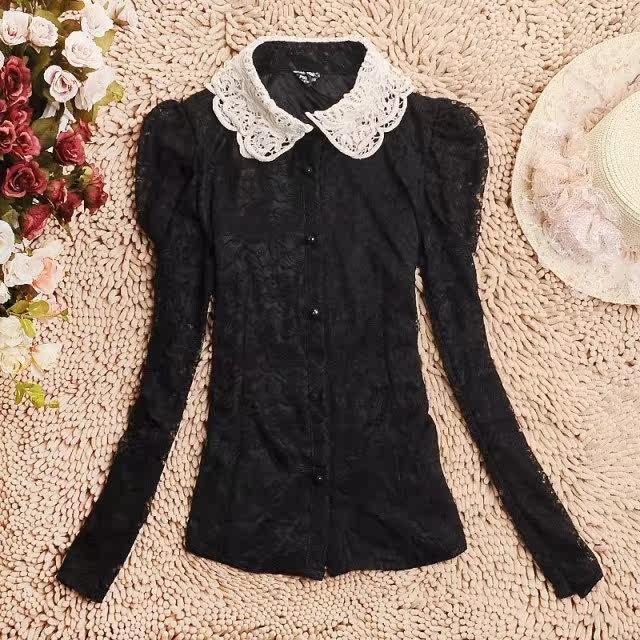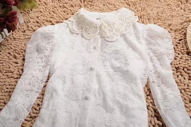 春装 新款泡泡袖女装 长袖娃娃领蕾丝衫 双层蕾丝雪纺衫开衫 韩版