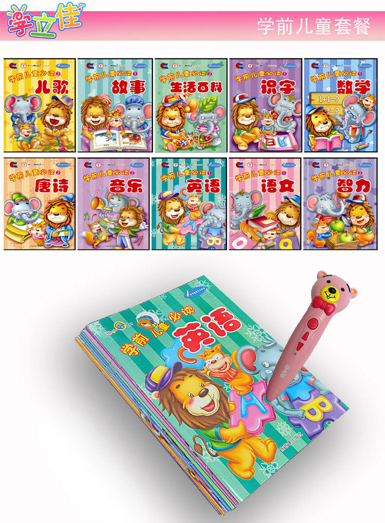 4、全套系列:点读笔+幼儿启蒙(12本)+学前儿童必读(10本)+儿童学习必备(10本)+12张挂图+10万个为什么(8本)+数据线+充电器+保修卡+说明书+精美礼盒 单价:180元/套 起批量1000套。