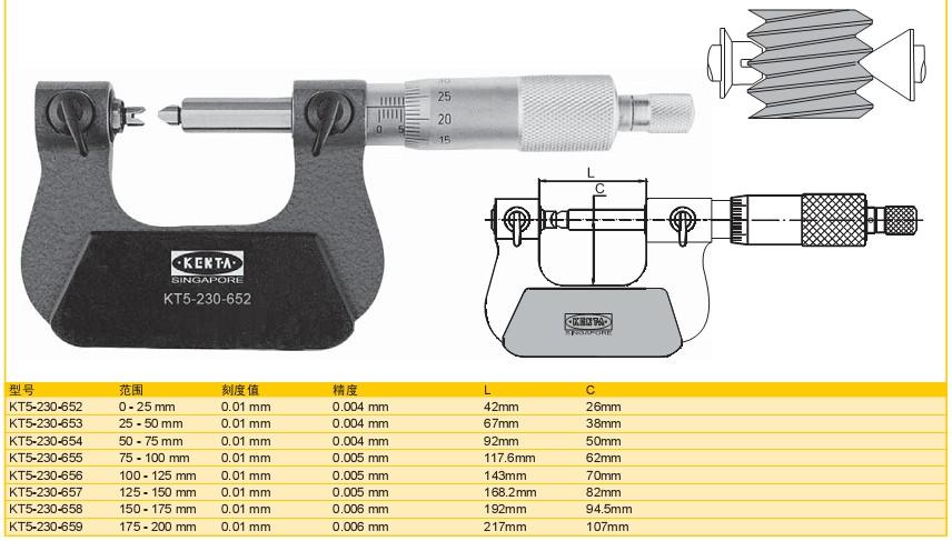 ·带有一个60°的V 型测砧和锥型心轴,易于测量英制或统一标准的螺纹中径: