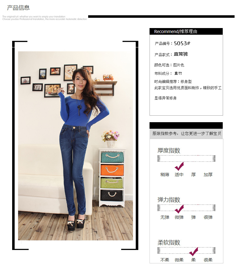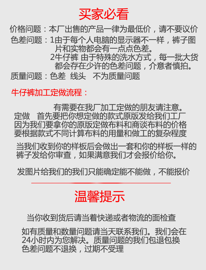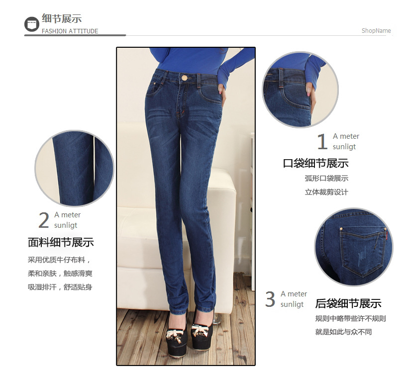 本公司主要生产:女士牛仔裤,男士牛仔裤,牛仔短裤,牛仔中裤并结合欧美,韩版等各种风格的牛仔系列服饰。产品远销全球以及全国各地批发市场,国外以非洲,东南亚,如马来西亚,菲律宾,缅甸,泰国居多。质量和服务都得到了广大客户朋友的认可。产品做工精致,精选纯棉高弹性牛仔洗水布,亲肤舒适,透气好,弹性佳,不易变形,不褪色,修身廓形,经典版型,简约时尚,可以随心搭配服饰,衬托出你干净整洁的精神面貌和窈窕的身材。我们也可以按照您的样板打板定做。