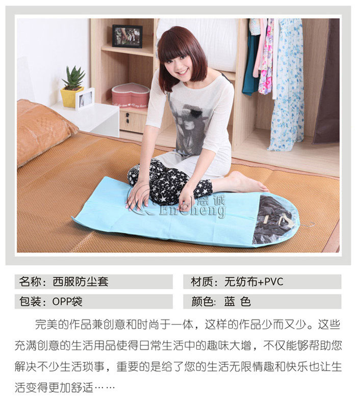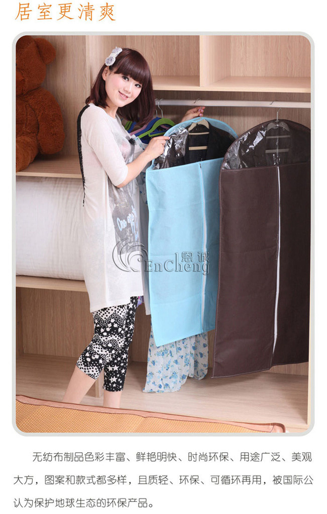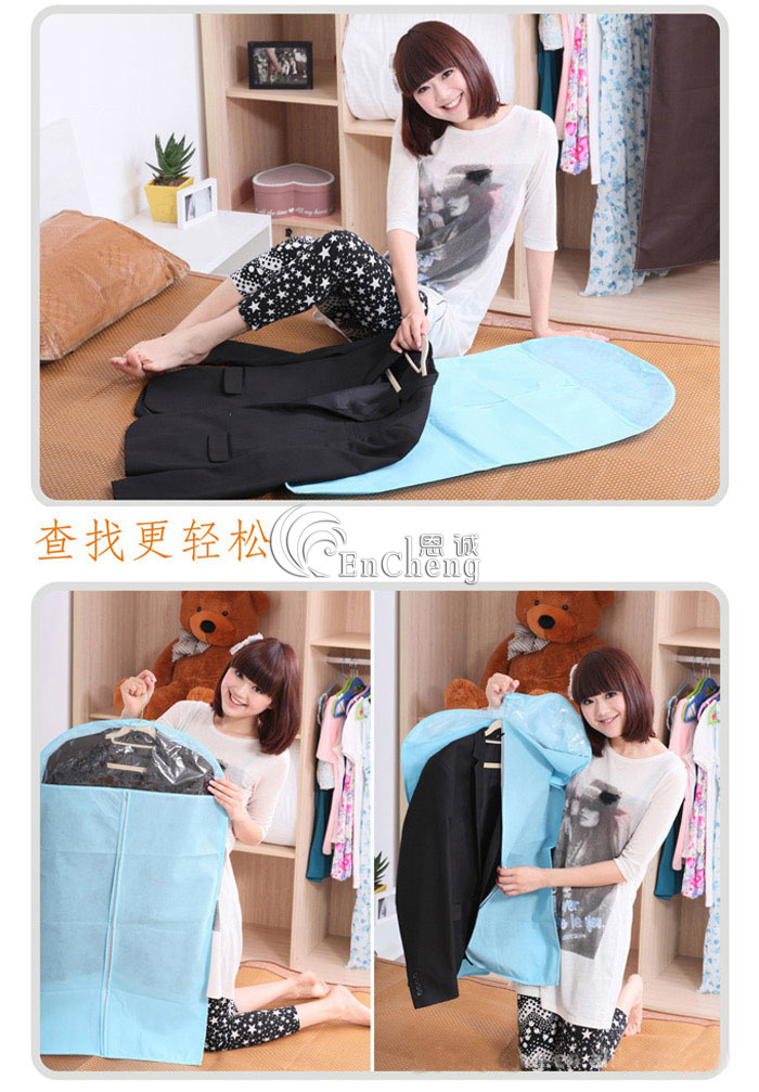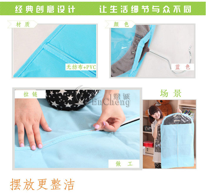 抗菌、防臭、防尘,让您的衣物井井有条,让您的衣柜更节省空间!具有良好的透气性,能防止灰尘和虫害的侵入,防潮、防霉。西服能通过全开的拉链收入和拿出,存放整齐,收取便利,更有透明窗,能让您一眼就能分辩出是哪件西服,是现代家居之必备。可收藏西装,西裤,毛衣,外套等。