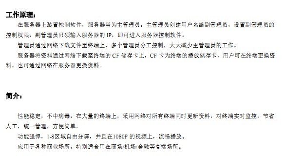 42寸高清1080p网络广告机 液晶显示方案专业提供商 主营7寸-80寸液晶广告机、网络终端一体机、液晶拼接墙、查询一体机。 应用范围: 电梯间,电梯口,商业写字楼,展览现场,娱乐休闲场所,宾馆酒店, 地铁站, 火车站,飞机场。 出租车内,公交旅游巴士,列车上,地铁内,飞机里。 商场超市,连锁店,专卖店,便利店,促销柜台等场合。 工厂承接OEM订单:款式可根据顾客看中或者要求的款式尺寸定制, 5台起订做任何尺寸和款式(由客户自己设计)在黑色框中可定做客户自己的LOGO或图案等