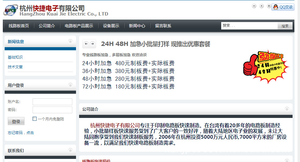 杭州快捷电子有限公司公司地址:浙江省临安市卦畈村62号T:0571-89080525-811FAX:0571-89080525-9手机:15058171555联系人:黄宗英Email:newpcb@126.com