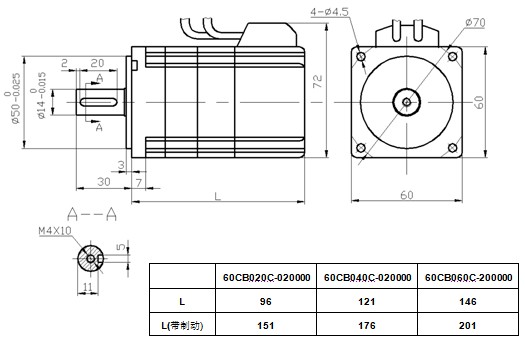 1.带制动功能的60系列伺服电机的机身长度比标准电机长55mm; 2.制动器的控制线与电机动力线一起引出,其中电机动力线已连接四芯插头,另两根悬空线即为制动器的控制线; 3.电机运转前请把制动器的控制线接到24VDC电源 (电源要求:2A ),制动器的控制线不分正负。