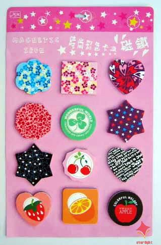 1)磁性冰箱贴:采用下面软胶磁铁+上面铜版纸彩色印刷腹膜制作而成。