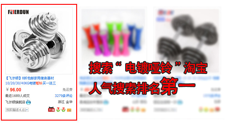【飞尔顿】8折包邮家用健身器材 10/20/30/40KG电镀哑铃买一送三:江苏 浙江 上海包快递