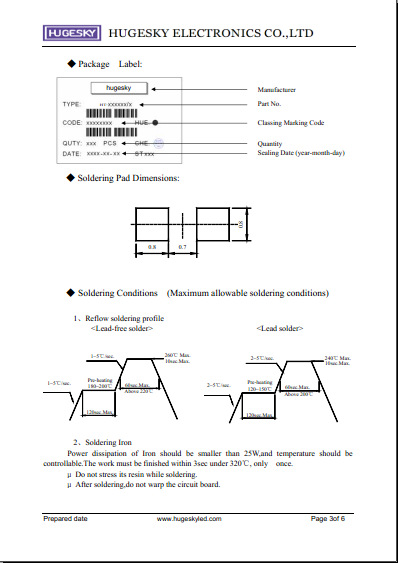不要使用不明化学液体清洗SMD LED:不明的化学液体可能会损坏SMD LED.当必要清洗时,把SMD LED沉浸在酒精里,在正常的室温下少于1分钟并且自然干燥15分钟,然后才开始使用.