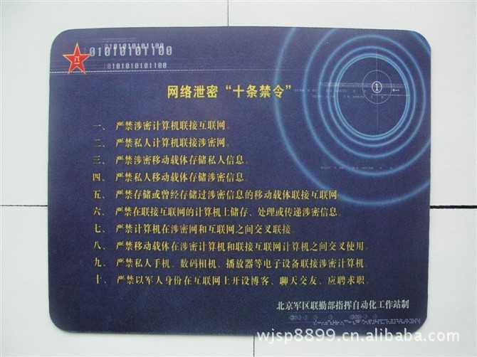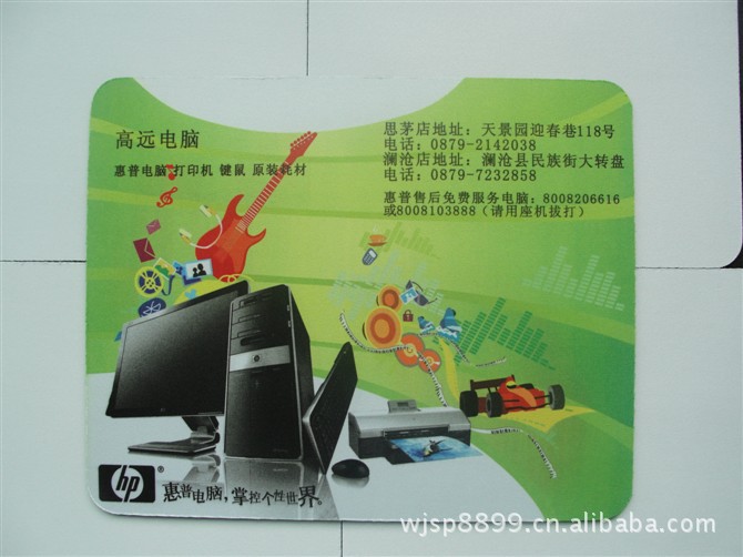 本公司生产制造天然橡胶鼠标垫 材质:天然橡胶加布 可印上贵公司宣传广告。单色丝印有黑 红 蓝 绿多种布面。尺寸通用规格是210*260*2 210*180*2 220*180*2等多个规格。彩色中采用热转印技术,将彩色图片转印鼠标垫上,适用鼠标,色彩鲜艳,不退色.