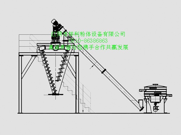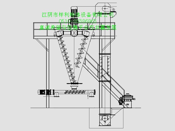 混合机由两根非对称螺旋的快速自转,物料向上提升,形成两股非对称沿筒壁由下向上的螺旋物料流(见图A、B)。转臂带动的螺旋公转运动,使螺旋外的物料不同程度进入螺柱包络线内,一部分物料被错位提升,另一部分物料被抛出螺柱,从而达到全圆周方位物料的不断更新扩散,被提到上部的两股物料再向中心凹穴汇合,形成一股向下的物料流,补充了底部的空穴,从而形成对流循环。(见图C、D)由于上述运动的反复,物料在较短的时间内获得了均匀混合,混合程度较高。