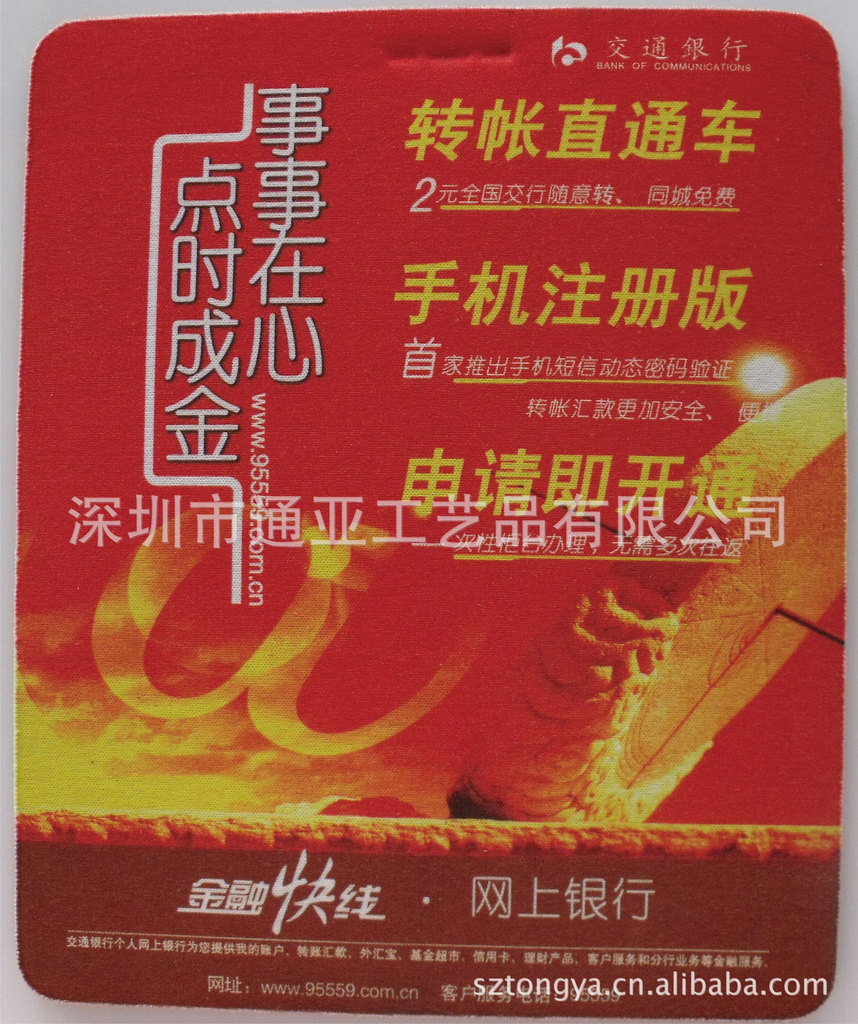 深圳市通亚工艺品有限公司是一家集自主研发,生产与销售为一体的综合性礼品公司。多年来我们致力于促销产品的深层开发,不断推出独特的系列产品:鼠标垫、桌垫、手机擦、电脑擦、磁性冰箱贴、钥匙扣、PVC电压包装袋、PP/PVC透明包装、手提袋等几十个系列,我们拥有实力雄厚的研发队伍。旗下设置一批先进设备:UV彩印机、丝网印刷、转印机、高周机、超声波机、切纸机等配套设备。