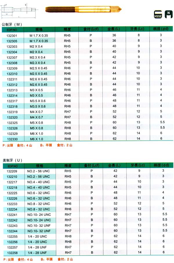 | 备注2:螺丝攻精度等级:OSG/TOSG级,RH4P、RH4B、RH5P、RH5B、RH6P、RH6B、RH7B、RH8B、RH9B;公制螺纹6H精度、美英制2B精度。 |