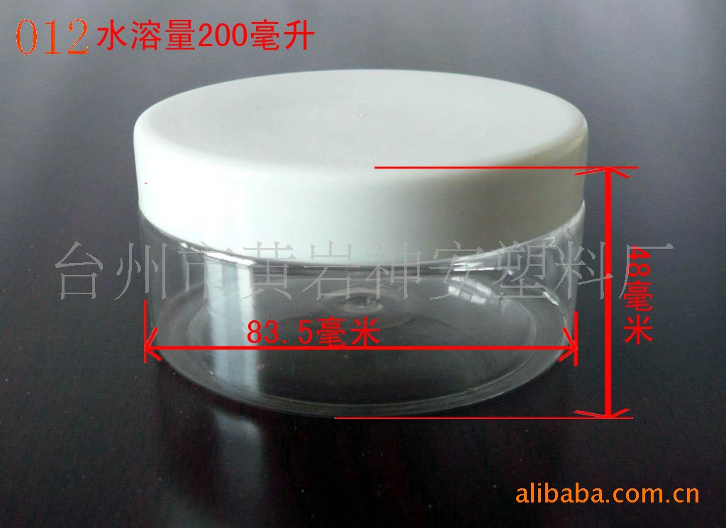 012:pet塑料瓶。 水溶量200g,材料pet. 瓶身直径83.5mm,瓶连盖高48mm,瓶内口径74mm,瓶连盖重35g. 适合装低温液体及固体包装.
