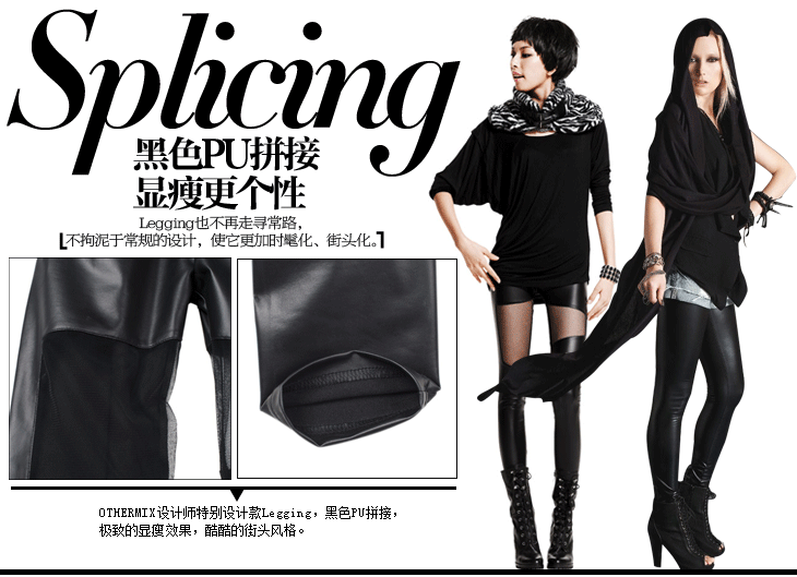 商品描述 | 这是一个皮革复兴的季节 从纽约到伦敦,从好莱坞到奥斯卡 这一季,连明星都难以抵挡仿皮打底裤的诱人魅力 超好的弹性,,清爽透气的面料 随意的搭配,不同的穿着方式,展露出不同的个性与独属自己的与众不同 做时尚的领航者,穿出有型有款的范儿 如果你没有一条这种仿皮的,那么你OUT拉~ 搭配长款的棉T,或雪纺的都是不错的选择,鞋子可搭板鞋亦可搭单鞋,或今年最IN的罗马鞋。简洁的搭配都可穿出大牌的风范。 网纱拼接设计,更显时尚,更添性感诱人魅力! |