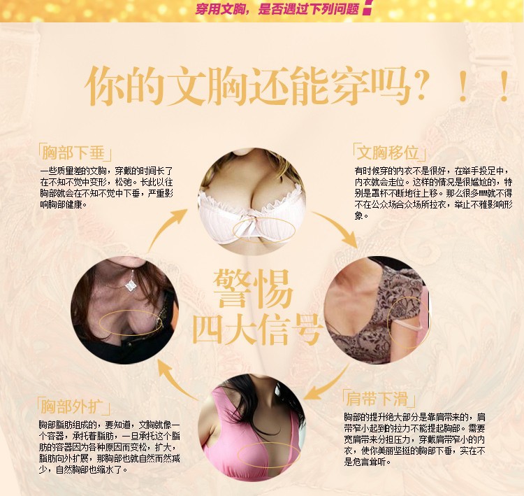 文胸的穿着方法 先将肩带挂在双肩,用双手托住罩杯下方,然后身体稍向前倾,使乳房完全套进罩杯里,再扣上背扣。用手将腋下乃至背部的赘肉往前拨,尽可能将赘肉拨入罩杯内。调节肩带至适合位置(肩带不宜过松,否则不利于保持胸型),略为整理使塑造的胸型自然对称后即可。