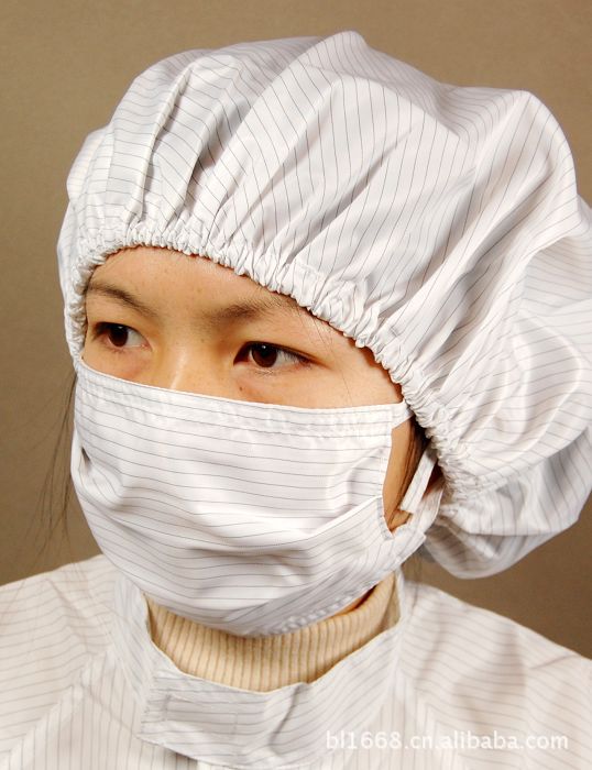 此产品由专用涤纶长丝与高性能永久性导电纤维经特殊工艺织造而成,用此种面料经特殊缝纫工艺制成的防静电披肩帽具有优良持久的防静电防尘性能,能有效地释放人体静电电荷。洁净绸织物密度要大于普通丝绸织物、达到不起毛、不起球、不脱落纤维、不起尘、不透尘、气密性好,达到国际标准。