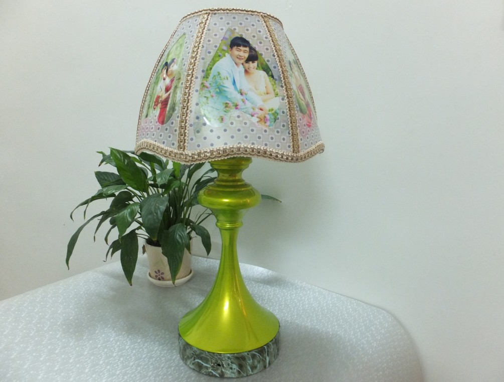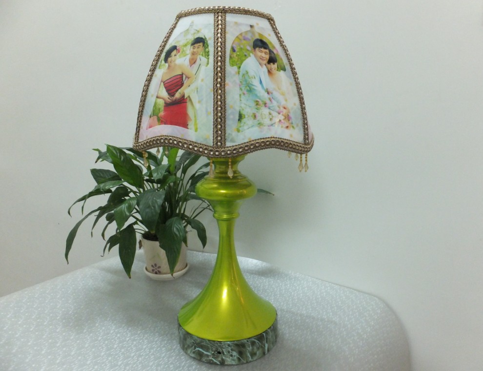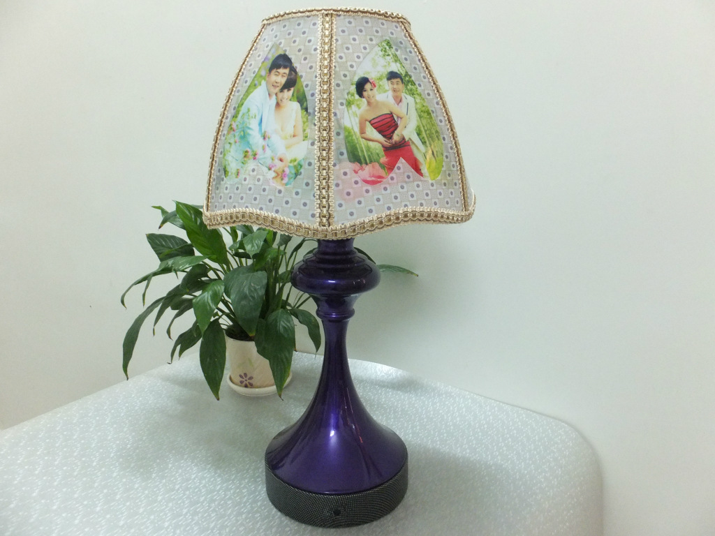 本产品是一种可放置照片、艺术照、婚纱照等装饰物的台灯,它包括灯座,固定在灯座上支撑杆以及支撑杆内部的光源和灯罩,在所述灯罩表面可以放置主人自己喜欢的照片,有浪漫的钢琴曲作为背景音乐,具有语音识别功能,只要说出对应的口令就会自动灯亮,音乐响起,让整个房间充满温馨的浪漫气氛。两分钟自动关闭。灯座上设有与之相适配的插座,普通的家用电源即可。本产品具有结构简单、装饰性强、实用性强等特点,欢迎来电咨询洽谈!