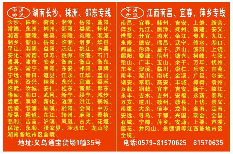 新增义乌至广西南宁、柳州、桂林、梧州、北海、崇左、来宾、贺州、玉林、百色、河池、钦州、防城港、贵港、凭祥、东兴专线.并可中转广西全省各地:南宁、武鸣、横县、宾阳、上林、隆安、马山、柳州、柳江、柳城、鹿寨、融安、三江、融水、桂林、临桂、灵川、全州、兴安、永福、灌阳、龙胜、资源、平乐、荔浦、恭城、梧州、藤县、蒙山、北海、岑溪、防城港、合浦、钦州、灵山、浦北、贵港、平南、桂平、容县、陆川、博白、兴业、北流、百色、田阳、田东、平果、德保、靖西、那坡、凌云、乐业、田林、隆林、西林、贺州、钟山、富川、河池、南丹、天峨、凤山、东兰、巴马、都安、大化、宜州、来宾、武宣、金秀、忻城、合山、崇左、扶绥、大新、天等、宁明、龙州、凭祥、东兴等各地市区及广西全境。新增义乌至江西南昌 宜春 赣州 吉安 景德镇 上饶 新余 萍乡 九江 鹰潭 抚州专线并可中转江西各地:新建 安义 进贤 分宜 渝水 余江 贵溪九江 永修 德安 瑞昌 武宁 修水 湖口 都昌 彭泽 星子 庐山 波阳鄱阳 婺源 信州 德兴 横峰 弋阳 铅山 广丰 玉山 余干 万年东乡 资溪 临川 崇仁 乐安 宜黄 南丰 黎川 南城 金溪 广昌 尔安 靖安 奉新 高安 丰城 樟树 袁州 万载 铜鼓 宜丰 上高 新干 峡江 永丰 吉水 吉州 安福 永新 井冈山 泰和 万安 遂川 赣县 上犹 崇义 南康 大余 信丰 龙南 全南 定南 安远 寻乌 于都 兴国 瑞金 会昌 石城 宁都 景德镇 乐平 浮梁 安源 上栗 芦溪 莲花等各地及江西全境.