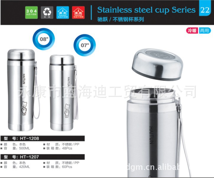 | 保温杯(壶) 1、 原材料:产品采用优质不锈钢和食品级塑料精工制造而成 2、 保温效果:常温保温 使用方法: 1、 按逆时针方向打开杯(壶)盖,使用前先倒入少量的沸水清洗去除异味。 2、 内盛装饮用水太满会溢出,以离杯口2厘米为佳。 3、 按顺时针方向拧紧杯盖,拧到最后几圈请慢慢拧紧,并确认拧紧。 4、 若长时间不使用,需把污垢清除掉,并用抹布充分擦拭干净。 注意事项: 1、 请勿将产品放在明火、高温物体旁边或电冰箱冷冻室,否则易产生变形和退色。 2、 不适宜放入易产生高压和含有盐性成份的物体。 3、 避免掉落、碰撞或用锐器打击,以免造成杯体变形或者损坏,影响产品的使用功效。 4、 请将产品放在小孩或智障人士触摸不到的地方,以免烫伤。 | |