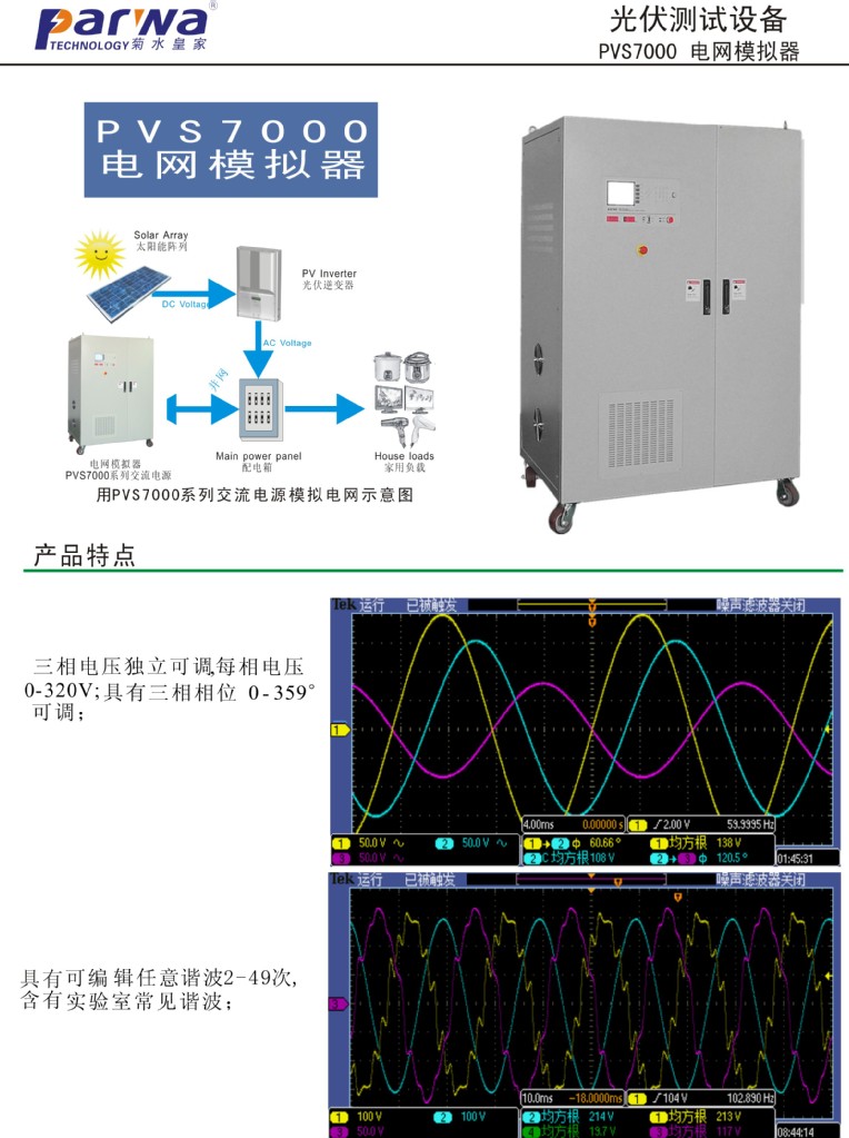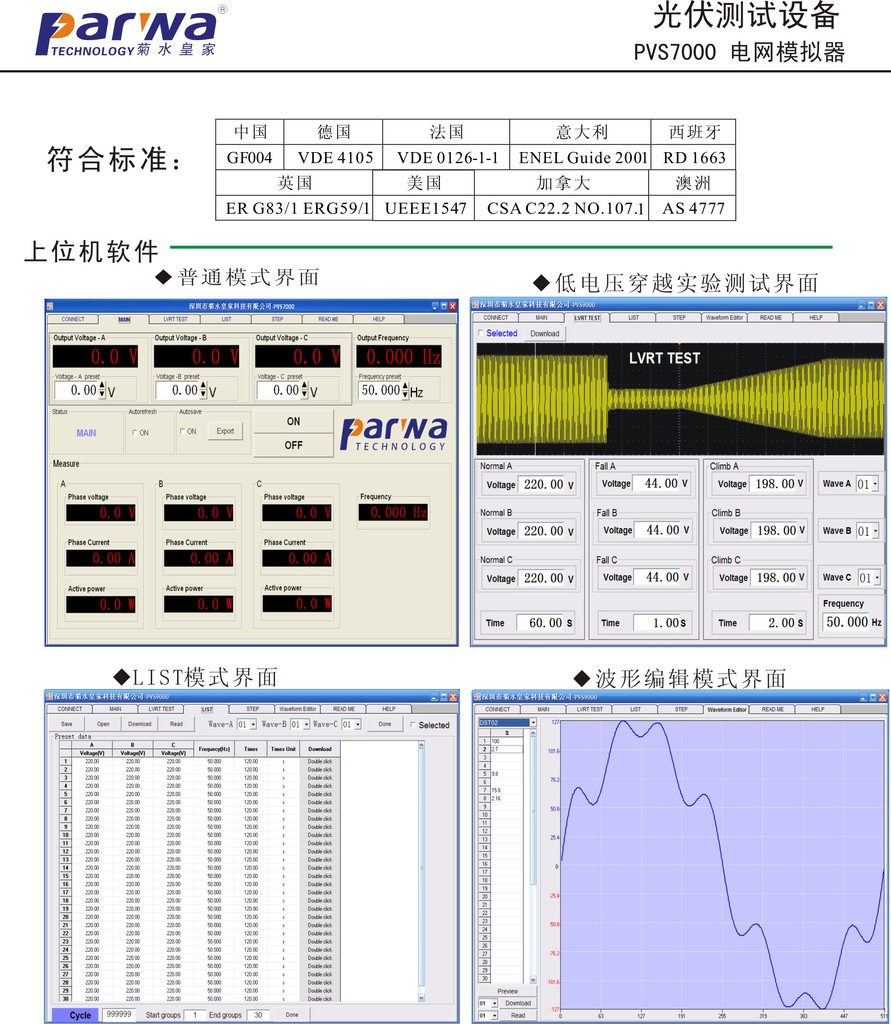 符合专用标准IEC62116-2008试验,用于模拟公用电网满足并网逆变器的防孤岛效应保护试验、过欠压保护试验、过欠频保护试验、抗扰度试验,满足逆变器并网条件检测需要,精确模拟电网的各种实验条件,有效检测并网逆变器保护功能。模拟各种复杂的电网环境,电压暂降、短时中断、电压变化,检测逆变器的综合工作性能状态。频率调节精度可以达到0.01HZ.电压可以精确在一个周波内实现调节.t使用先进的直接数字合成(DDS)波形产生技术,电压和频率稳定度高;具有电压反灌自动保护功能。