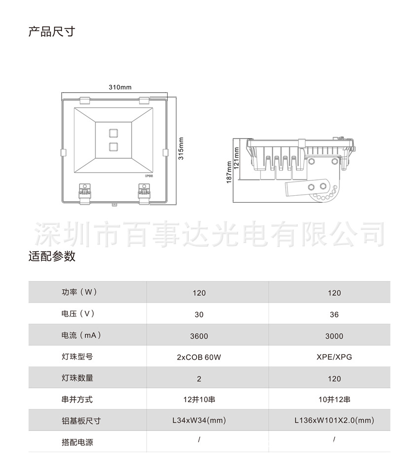 . 带热管 *适用于:政府亮化工程,商业场所,机场,地铁,高架立交桥,广告牌、体育馆,建筑地标等内外墙面的全景照明。 特点: - 采用单颗120W大功率LED作为光源。灯珠采用进口芯片,光衰小,光色纯,无重影等特点;