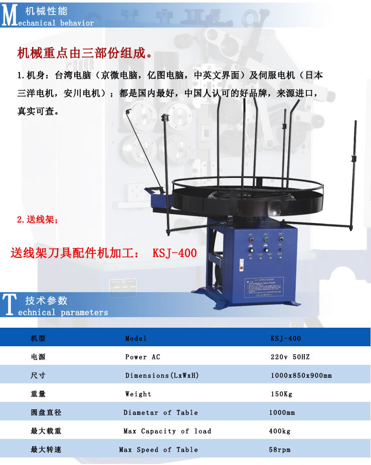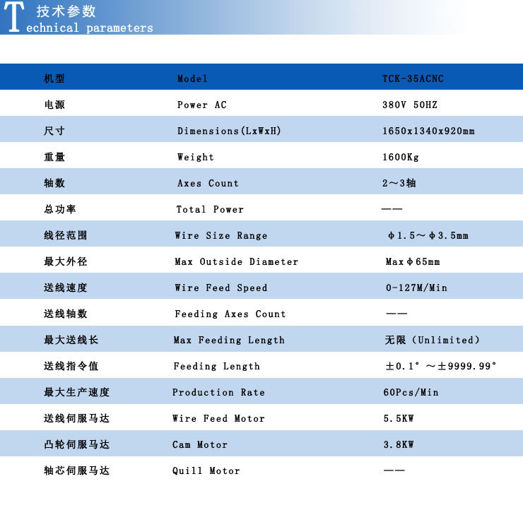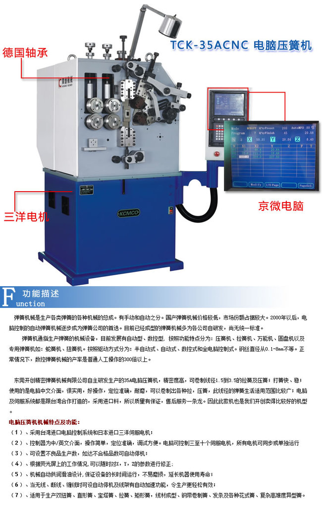 创弹簧机械供应各种电脑弹簧机、压簧机、线成型机:TCK-8CCNC (0.15-0.8mm)、TCK-26ACNC(0.8-2.6mm)、TCK-20BCNC(0.2-2mm)、TCK-35ACNC(1.5-3.5mm)、TCK-35WCNC(1.5-3.5mm)、TCK-35WZCNC(1.8-4.0mm)有转线功能、TCK-440ACNC(1.6-4.5mm)、540ACNC(1.6-4.5mm)、580ACNC(3.0-8.0mm)、680ACNC(3.0-8.0mm)、80WCNC(3.0-8.0mm)、TCK-1240WZCNC十二轴无凸轮电脑弹簧机(1.8-4.5mm)、TCK-1260WZCNC十二轴无凸轮境电脑弹簧机(2.5-6.0mm)。伺服电机采用三洋、安川电机。质量稳定、价格合理、服务满意。欢迎来电咨询:15024039319 李先生 0769-22024833 QQ:2633439545 更多信息源自: 。