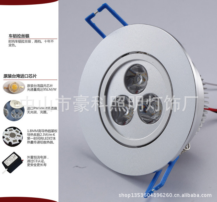 使用芯片:台湾晶元光通量:90-100LM色温:暖白2700-3500K,中性白4000-4500K, 正白5500-6500K单颗LED功率:1W/320MA可选透镜:5度,8度,15度,25度,30度,45度,60度,90度,120度环境温度:-35度~45度控制方式:外置恒流驱动器色彩效果:单色乏光/投光寿命大于5万小时质保:3年此产品适合于商店展示窗.饭店.餐厅.室内装饰照明.展厅.艺术厅.博物馆.办公室.阅览室.酒吧.酒柜.的士高.卡拉OK等照明产品特性: 1、产品采用超高亮台湾晶元芯片LED灯珠光源,用深圳封装技术生产,内置恒流驱动电源、铝基板,确保灯具性能稳定。节能省电、不发热、寿命长、能耗低、绿色环保等。可以根据客户的要求或者指定芯片(CREE)生产加工。 2、产品LED光源,色彩鲜亮,色泽纯正,有白色、暖白等,可按客户要求搭配颜色。3、电压宽频率输入无频闪,瞬态响应快(无延时)无频繁开关损坏现象,非常适合开关次数频繁、电压波动范围大的场合。4、高效恒流驱动电源,在相同条件下,5W LED球泡灯相当于40-50W节能灯的亮度,省电率高达75-80%。LED大功率的使用寿命长达50000小时以上,是普通白炽灯寿命的20倍以上,且3000小时衰减<3%,40000小时衰减<30%。避免了经常更换射灯,减少了维护管理费用。 5、灯体材质采用铝材压铸工艺,表面经氧化或电镀处理。独特的内部通气散热结构设计,产品重量轻、散热好、外型美观高档。安装方便,节能省电,亮度强,灯泡使用寿命长达5万小时。您永远不用为浪费电和换灯而烦恼!