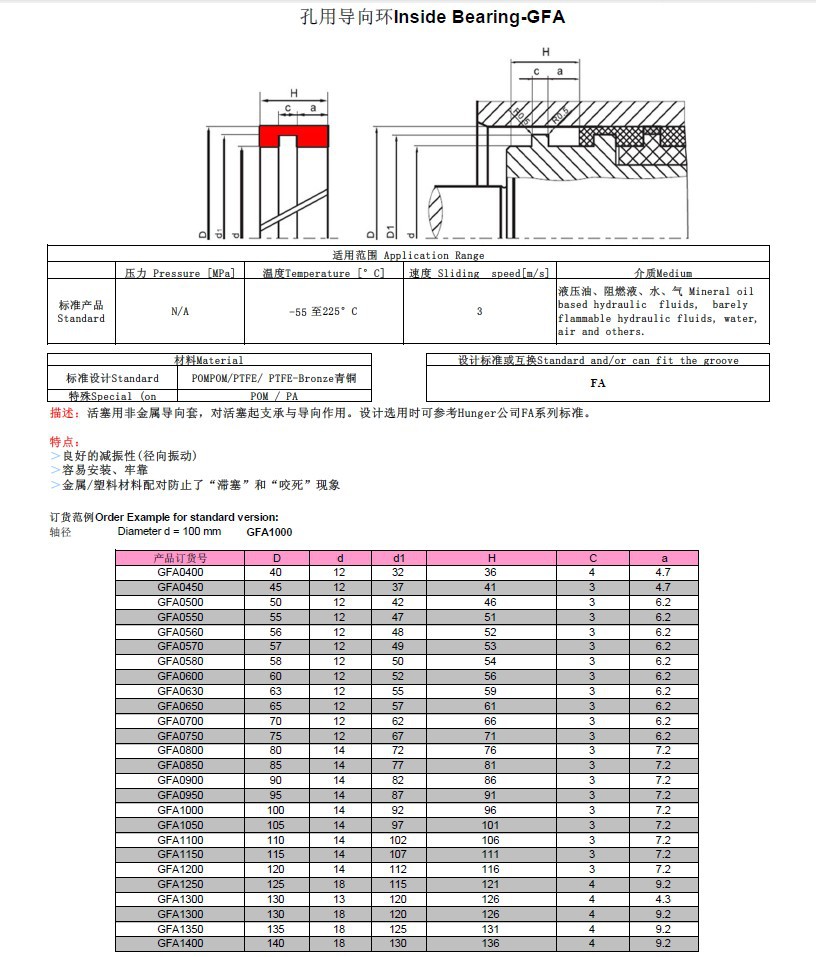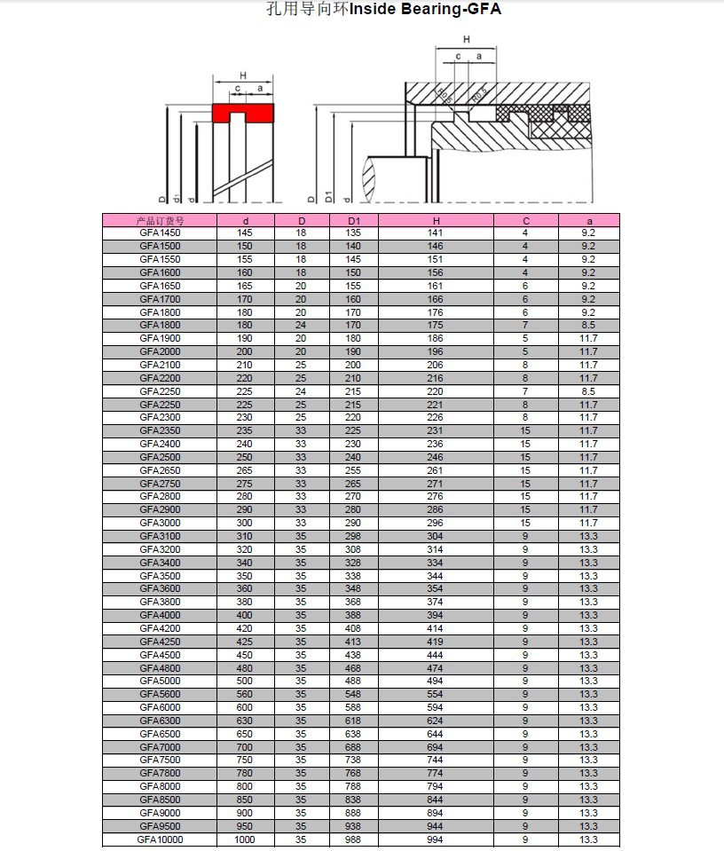一、性能与用途 导向套GFA是活塞用导向套,对活塞起支承与导向作用。二、材 质 尼龙PA、聚甲醛POM及聚四氟乙烯PTFE。三、工况条件 工作温度:-55~+225℃(在120℃以上,采用PTFE);