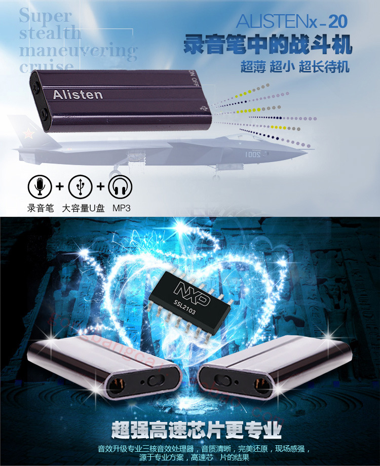 1:音效升级专业三核音效处理器,音质清晰,还原,现场感强,源于专业方案,高速芯片的结果(超好音质,绝对自信!媲美您周围任何品牌录音笔!
