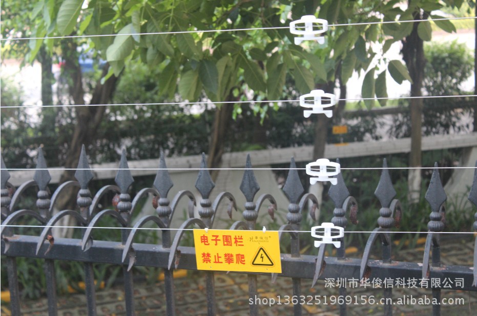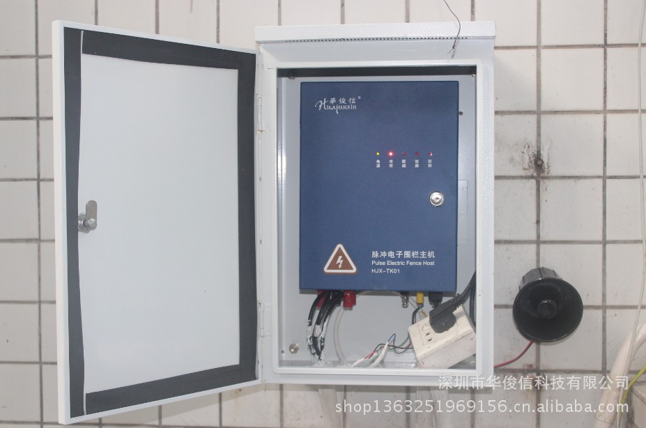 电子围栏分两个部分组成,电子围栏系统主机部分和电子围栏周界部分。电子围栏系统主机部分采用电子围栏主机,液晶键盘,警号,避雷器,室外防水箱,电池.电子围栏周界部分采用终端杆,承力杆,绝缘子,固定件,万向底坐,高压线,合金线,线线连接器,中间收紧器,围栏警示牌,电源线,信号线. 当有人试探接触脉冲电子围栏时,就会被脉冲电子围栏上的高压脉冲击退,若有人破坏或强行入侵时,电子围栏主机探测到电子围栏周界部分被破坏和有人非法翻越时造成的电子围栏合金线短路、断路或者恶意拆开主机时,电子围栏主机发出报警信号,并通过报警线路传输至管理中心。管理中心的保安人员通过液晶键盘或电子地图,可以迅速确定非法翻越的具体位置。同时通过视频联动,使相应的摄像机图像画面在监视器上弹出,使管理中心的保安人员能观察到现场情况。电子围栏主机报警信号也会同步触发现场警号发出报警声,夜间还可以触发现场灯光给摄像机补光,使企图入侵者无机可乘.以达到事先阻挡之功能. 相对传统的电子围栏产品,华俊信科技在技术上实现了革命性的突破,也是目前国内最先进的电子围栏产品,主要功能体现如下: