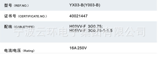 宁波云环电子集团有限公司创建于1985年,所属43家紧密层企业,二家高科技企业。现拥有固有资产2.2亿元。占地面积35万平方米,建筑面积25万平方米,员工2800人,专业生产电源线,橡胶线,插头,插座,线盘,灯具及小家电产品。公司从1989年起积极采用国家和国际标准组织生产,以获得国家CCC;美国UL,CUL;德国VDE,GS;英国的BSI;荷兰的KEMA;澳大利亚SAA等二十个国家的安全认证,并通过了ISO9001;2000质量管理体系认证,公司采用EPR管理系统。公司奉行以“优质拓市场,诚信赢顾客”的质量方针,立足国内,面向世界,产品畅销欧洲,美洲,澳洲,非洲,中东,南非等国家和地区。云环商标被认为浙江省著名商标。