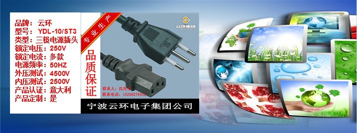 宁波云环电子集团有限公司创建于1985年,所属43家紧密层企业,二家高科技企业。现拥有固有资产2.2亿元。占地面积35万平方米,建筑面积25万平方米,员工2800人,专业生产电源线,橡胶线,插头,插座,线盘,灯具及小家电产品。公司从1989年起积极采用国家和国际标准组织生产,以获得国家CCC;美国UL,CUL;德国VDE,GS;英国的BSI;荷兰的KEMA;澳大利亚SAA等二十个国家的安全认证,并通过了ISO9001;2000质量管理体系认证,公司采用EPR管理系统。公司奉行以“优质拓市场,诚信赢顾客”的质量方针,立足国内,面向世界,产品畅销欧洲,美洲,澳洲,非洲,中东,南非等国家和地区。云环商标被认为浙江省著名商标。