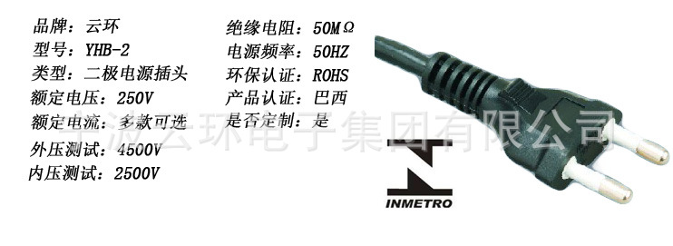 厂家直销 巴西插头 巴西认证电源线插头 两芯插头 YHB-2插头