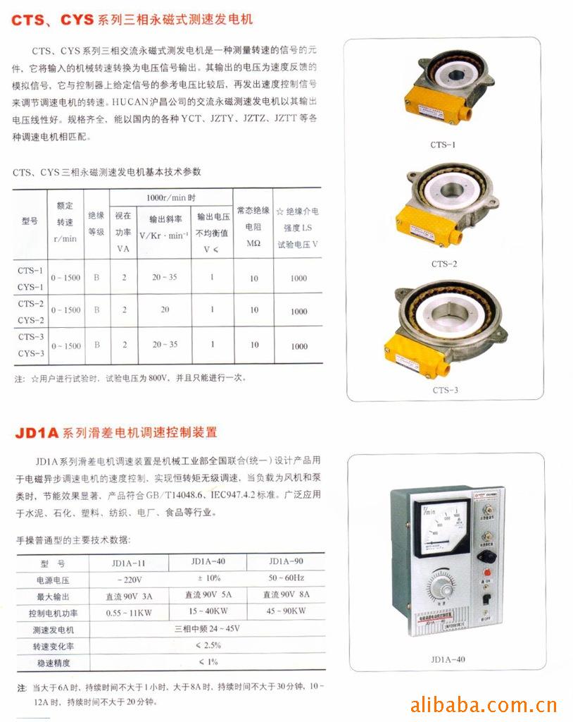 CTS、CYS系列三相交流永磁式测发电机是一种测量转速的信号的元件,它将输入的机械转速转换为电压信号输出。其输出的电压为速度反馈的模拟信号,它与控制器上给定信号的参考电压比较后,再发出速度控制信号来调节调速电机的转速。HUCAN沪昌公司的交流永磁测速发电机以其输出电压线性好。规格齐全,能以国内的各种YCT、JZTY、JZTZ、JZTT等各种调速电机相匹配。
