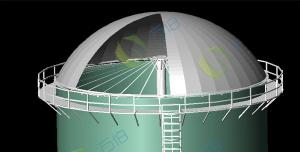 安装于厌氧罐上方,经济性较高。结构较紧凑,节约了气柜所占的土地资源,同时节约了厌氧罐顶盖和气柜基础。当罐体直径较大时安装传统的硬顶盖不太方便,此时使用WY型一体化气柜较容易为了不让内膜接触到沼液,罐口一般需要增加伞状网架兜住内膜。伞状网架不能有毛刺、锐利点以免损坏内膜,网架的受力按照1.5KP设计。故此气柜内膜施加在网架上的力不得超过1KP(网架设计1.5KP为安全设计),当气柜压力大于1KP时需要安装标准安全保护器保护内膜及网架安全。[