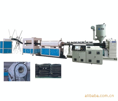 用途: ★配置聚烯烃专用单螺杆挤出机,具有高速挤出,高效塑化等特点。 ★专用的分离型混炼螺杆和螺旋结构机头,流道合理、管材内外壁光滑。 ★特殊设计的定径冷却方式:生产范围φ50-200mm,生产速度达0.4-1.5米/分。 ★高灵活性,适用于所有聚烯烃材料的共挤、可挤出多种不同规格的螺旋增强管,可使用回收料。 ★优化设计的铜质螺旋定径套,入口端带有可预冷却装置和强力吸真空装置,适用于该管材的高速挤出。 ★特殊设计的喷淋冷却水箱。 ★箱体由不锈钢制作。 ★高效率的水泵和特殊的喷淋头带来高效的喷淋冷却。 ★纵向移动电机调节,上下左右可实现三维调整。 主要技术参数 挤出机 | SJ-90/30B | SJ-65/30B | 机头 | 75-200 | 50-150 | 定径水槽 | SGZL-200 | SGZL-150 | 牵引机 | SLQ-200 | SLQ-150 | 缠绕机 | SQ-200 | SQ-150 |