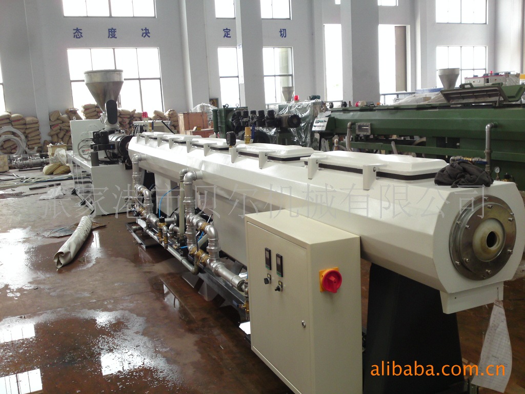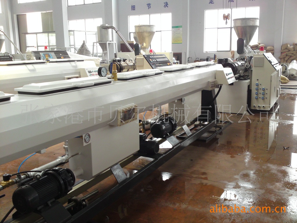 主要用于生产农用给排水、建筑给排水、线缆敷设等方面的各种管径、壁厚的塑料PVC管材,该机组由锥形双螺杆挤出机、真空定型台、牵引机、切割机、翻料架等组成。螺杆挤出机及牵引机采用进口交流变频调速装置,真空泵及牵引电机均采用优质产品。牵引有二爪、三爪、四爪、六爪等牵引方式。可选用锯片或行星切割形式,另可带计长及增厚装置,机组性能可靠、生产效率高。本公司可根据客户的要求,配置专用装置生产螺旋消音管和芯层发泡管机组。